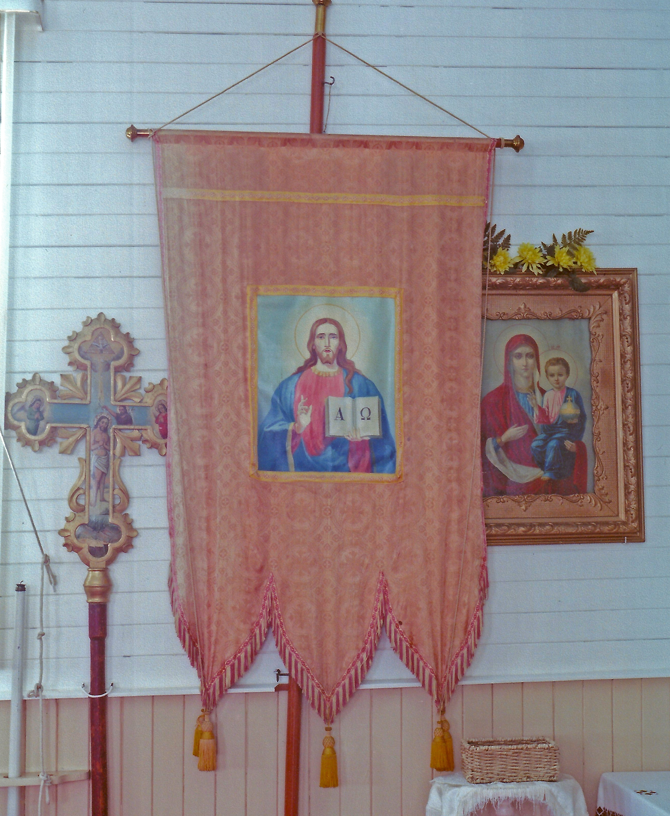A banner featuring the Pantocrator in St. Mary the Protectress UOC, Boriwitzi, near Willingdon, AB. Photo by S. Demchinsky (2013).
