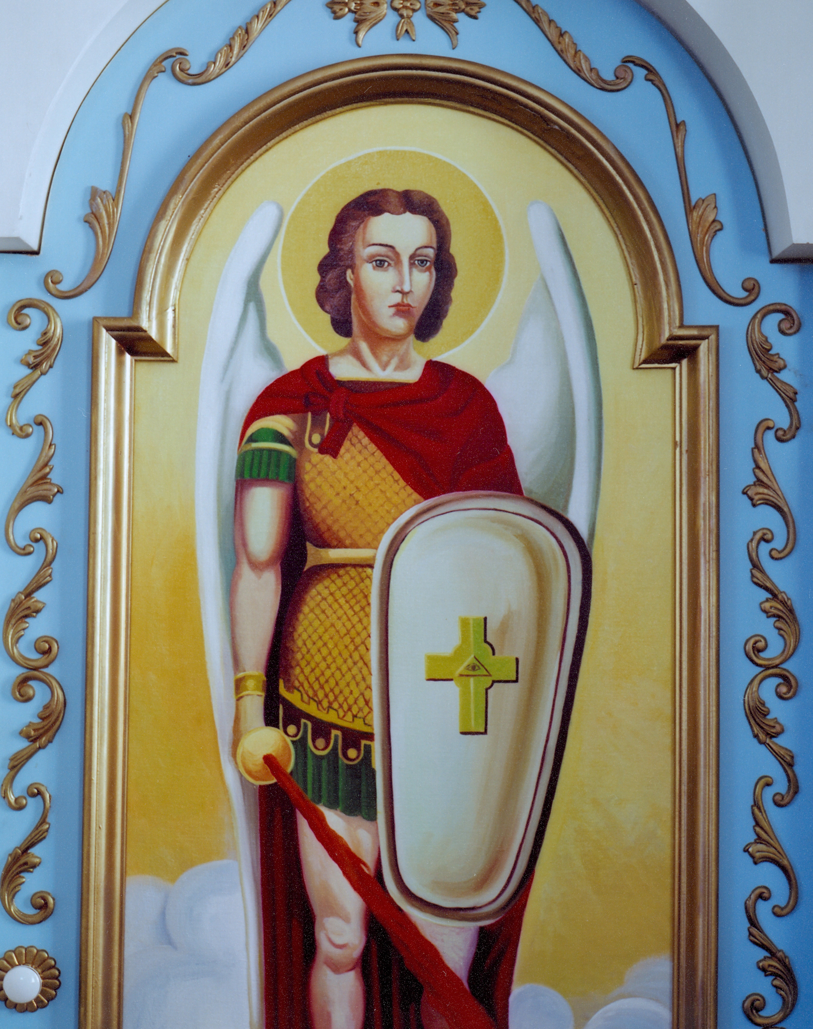 St. Michael on the deacons door of Holy Trinity UOC at Calmar, AB. Photo by S. Demchinsky (2010).