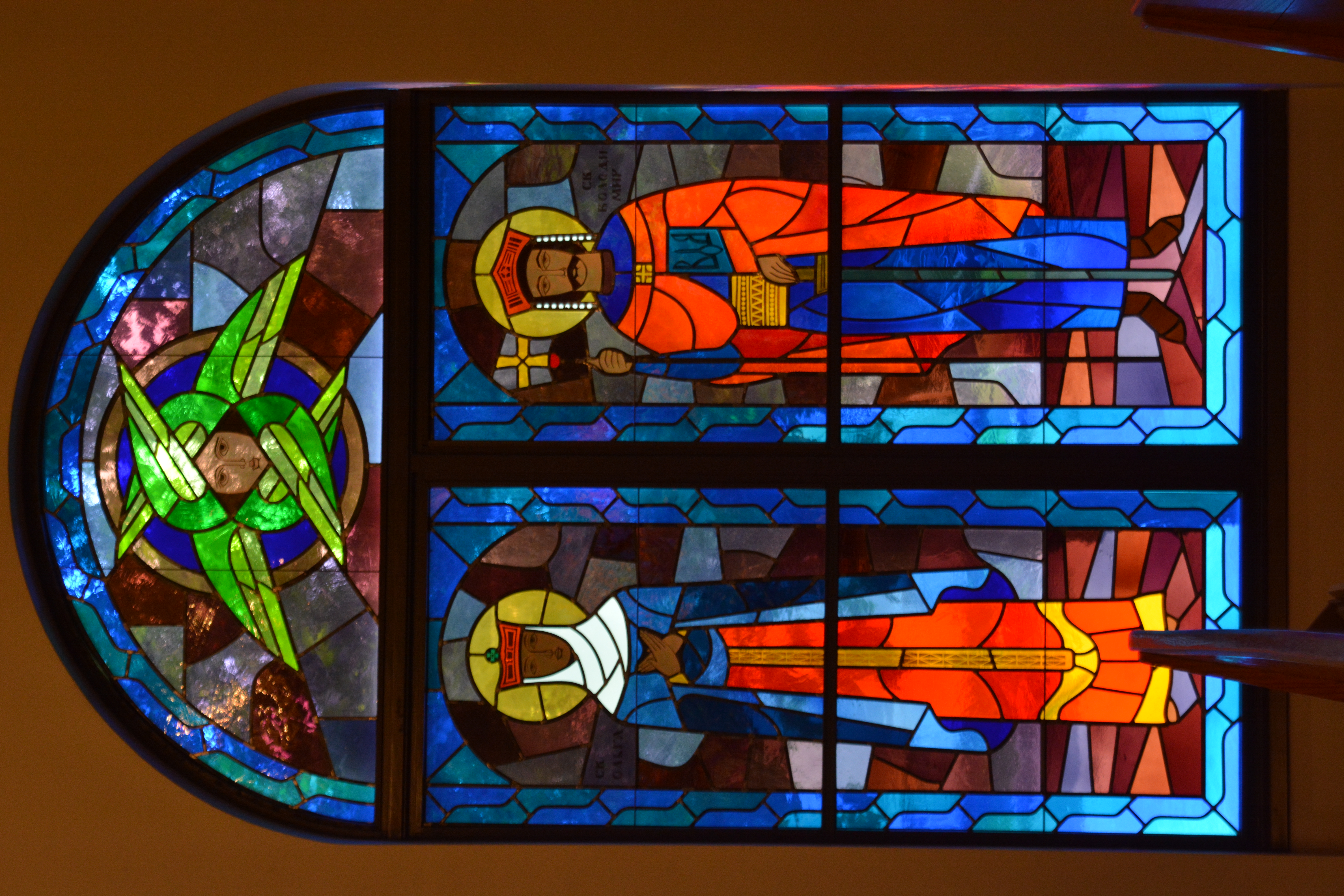 An example of one of the many stained-glass works in St. Andrew UOC, Edmonton, AB. Photo by S. Demchinsky (2023).