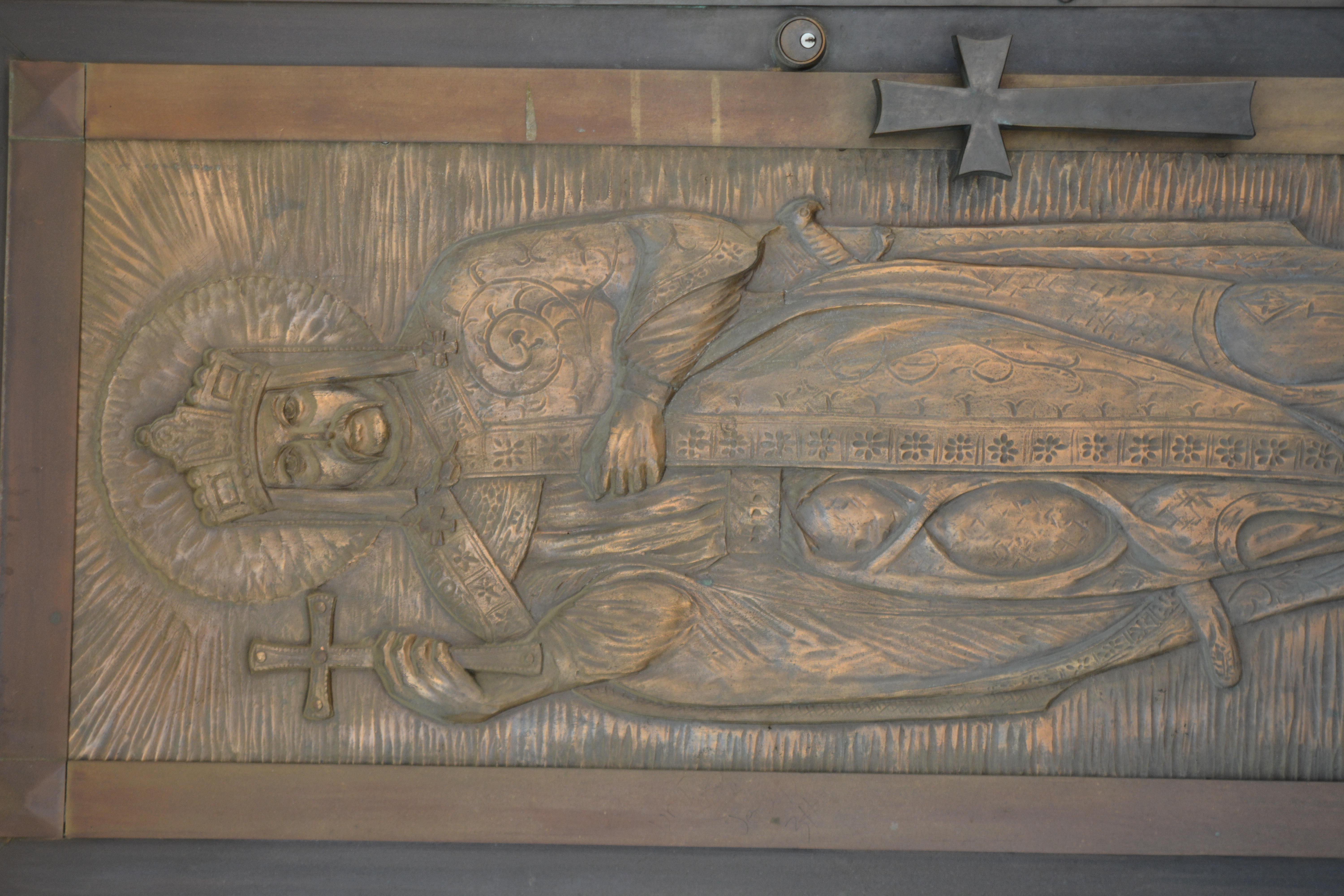Detail of St. Voloymyr on the front of St. Elias UOC, Edmonton, AB. Photo by S. Demchinsky (2023).
