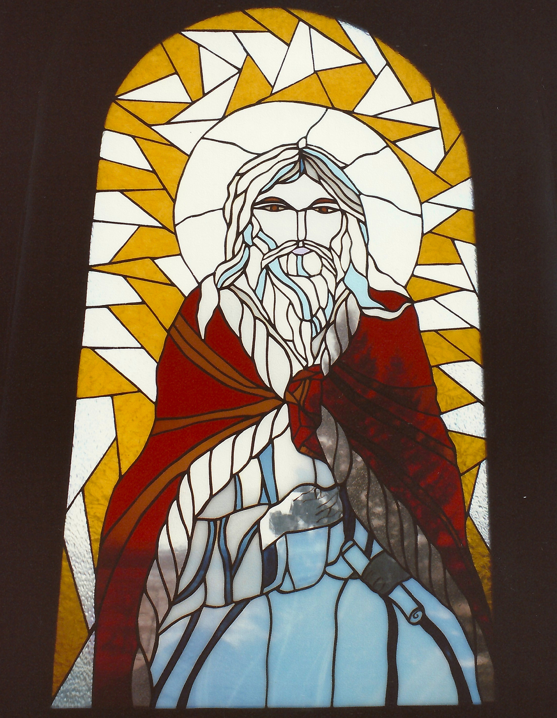 A stained-glass window featuring the Prophet Elias in St. Elias UOC near Luzan (Toporiwtzi), Alberta. Photo by S. Demchinsky (2013).