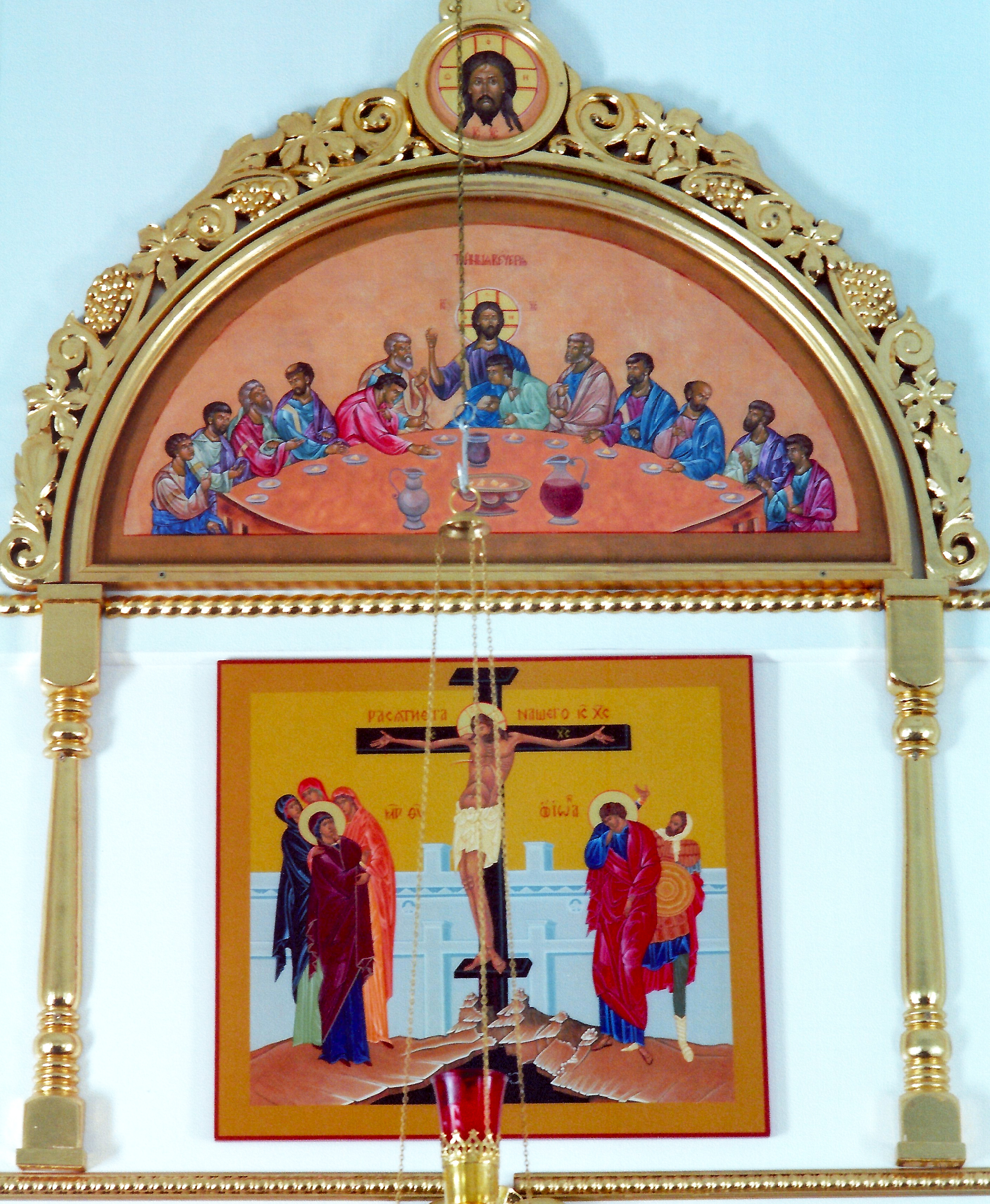 The "Mystical Supper" and "Crucifixion" icons on the iconostas of Holy Trinity UOC in Mamaetsie (Brosseau), AB. Photo by S. Demchinsky (2013).