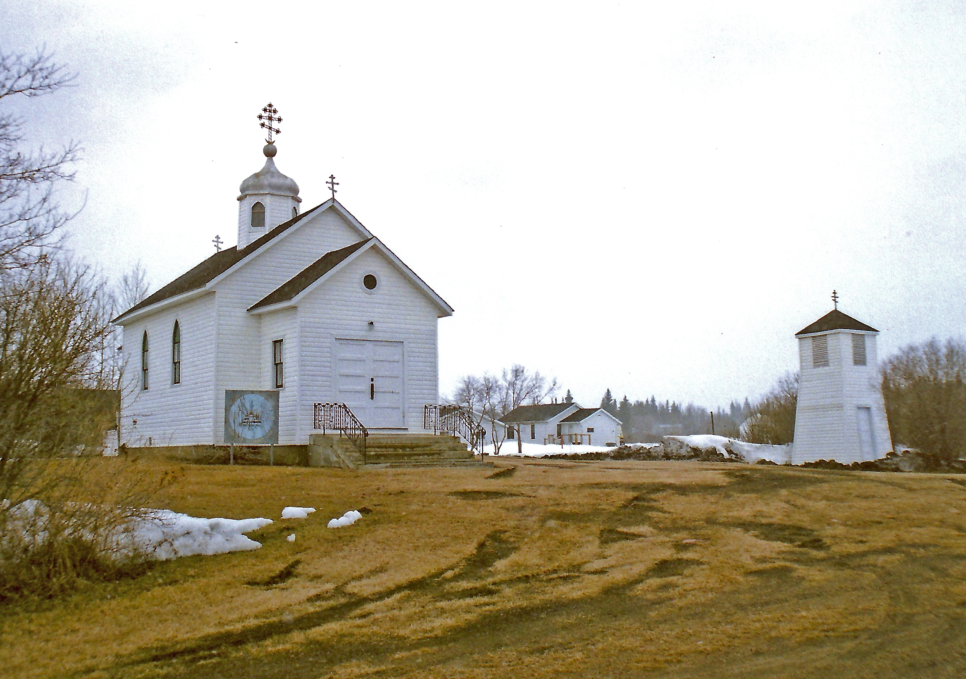 The Dormition of St. Mary UOC, shown with the belfry, at Musidora, AB. Photo by S. Demchinsky (2013).
