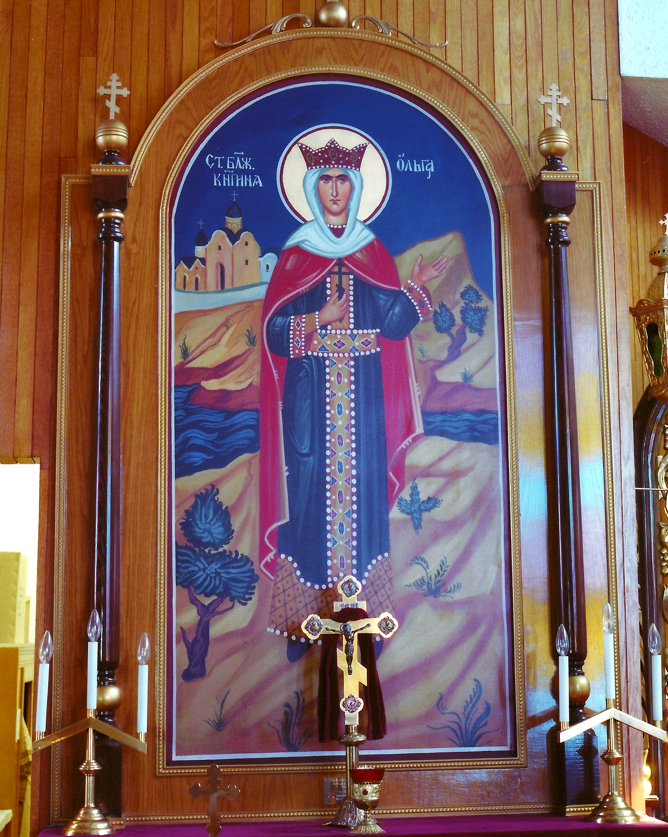 Icon of St. Olha to the left of the iconostas of St. Volodymyr UOC in Vegreville, AB. Photo by S. Demchinsky (2013).