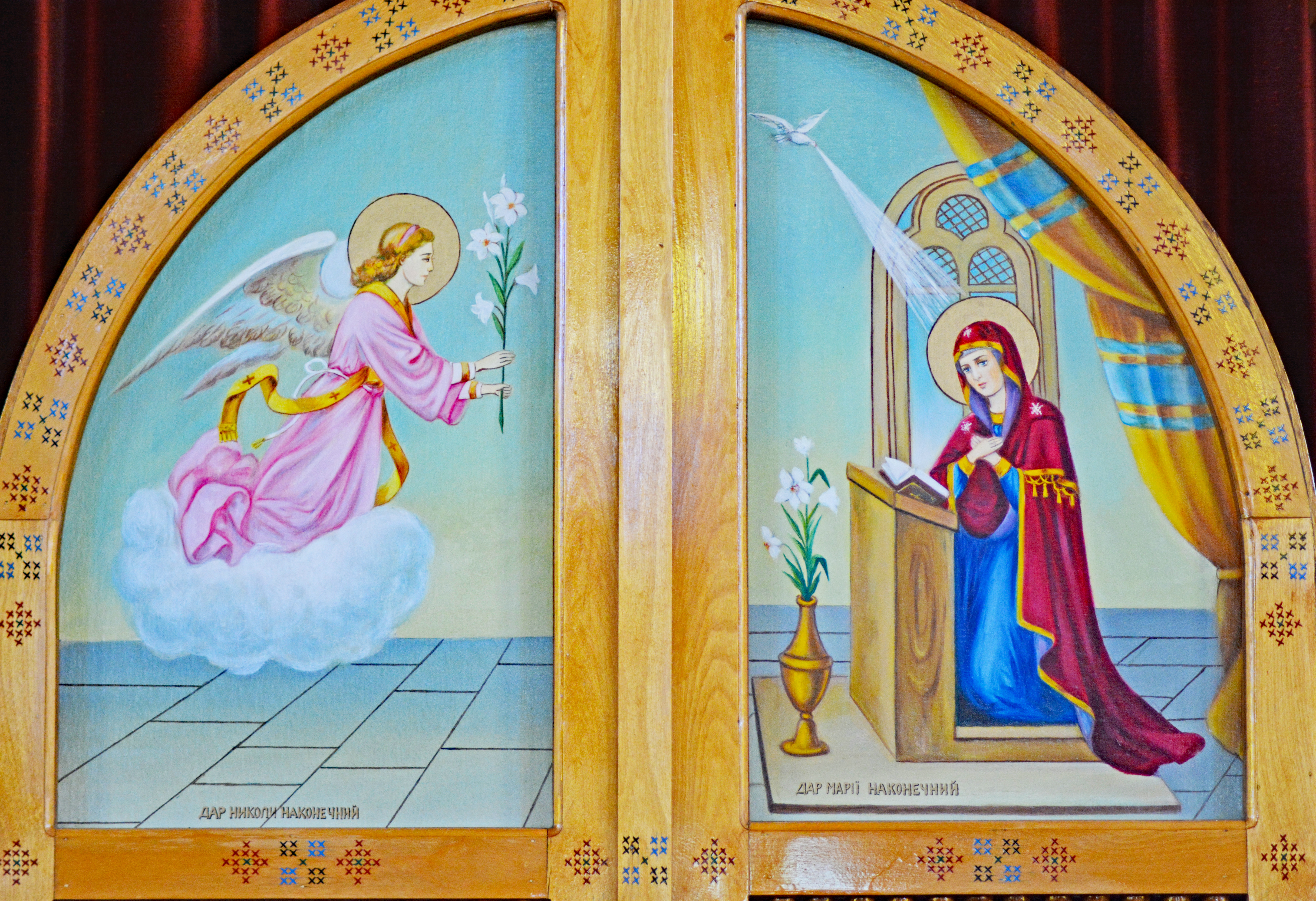 The Annunciation section of the Royal Doors in Sts. Peter & Paul UOC in Kelowna, BC. Photo by S. Demchinsky (2024).