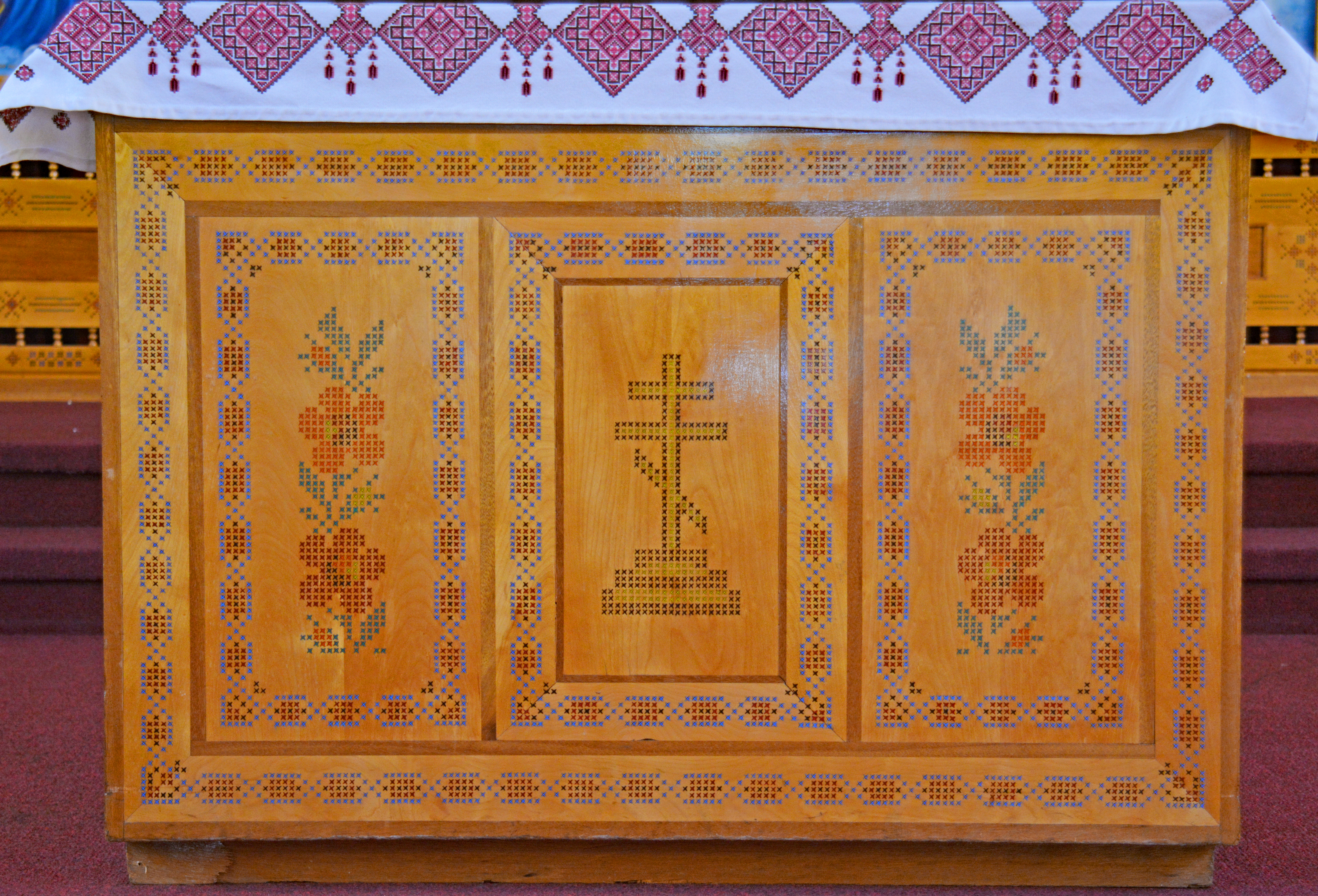 A detail of the woodwork on the tetrapod and iconostas of Sts. Peter & Paul UOC in Kelowna, BC. Photo by S. Demchinsky (2024).
