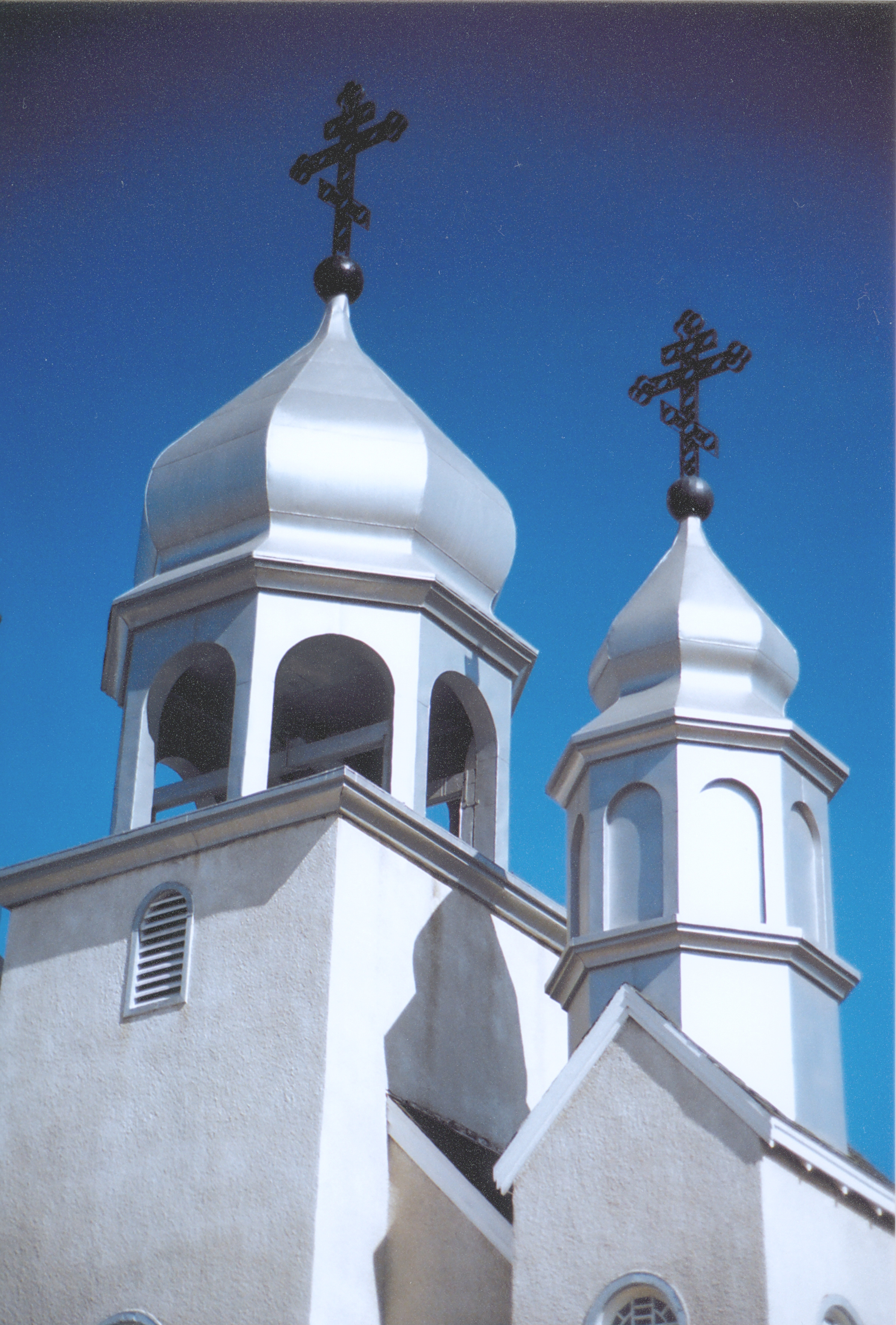 Image of St. George's church in Flin Flon, MB, showing one of the minor cupolas and the central frontal dome that serves as a belfry.