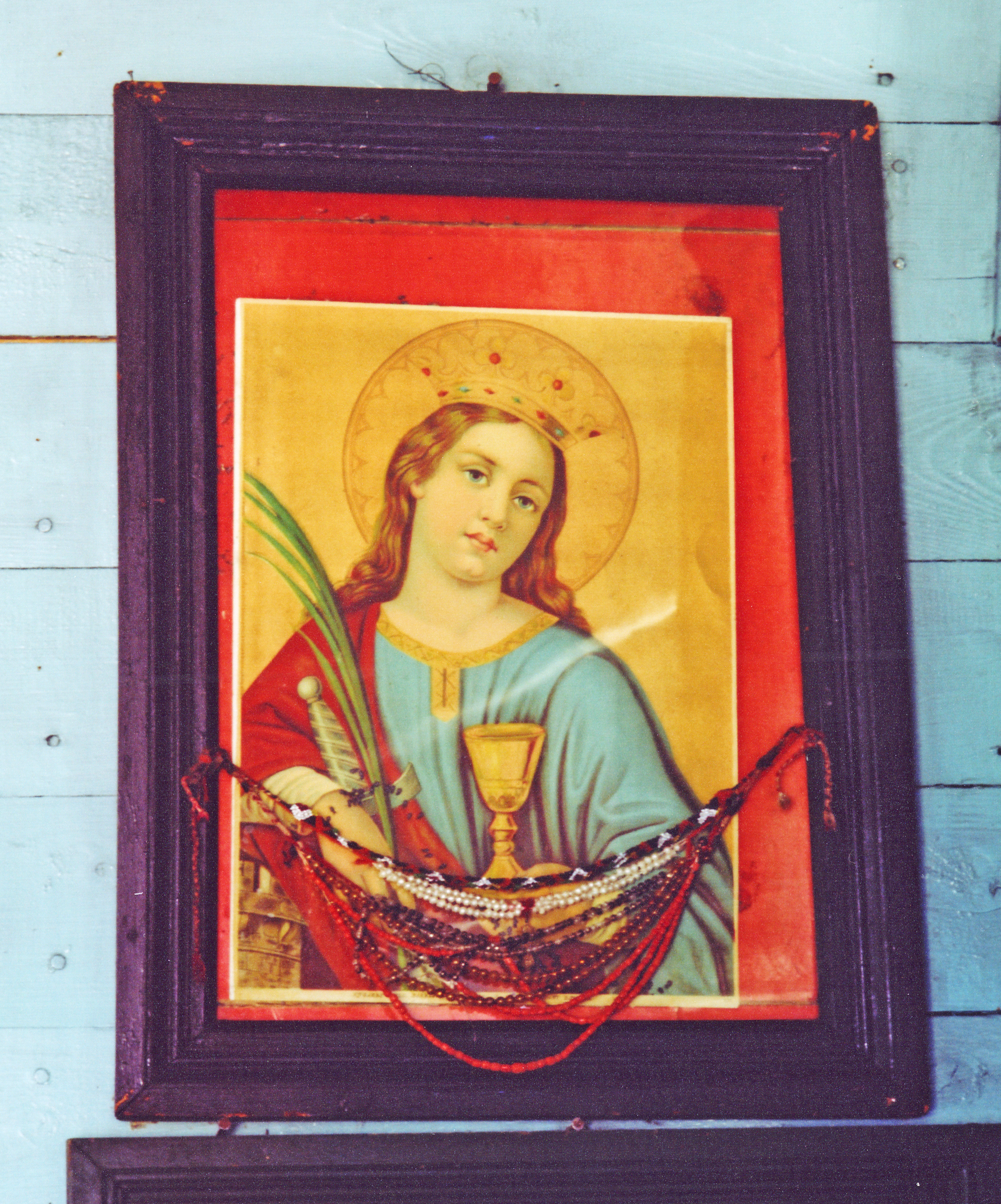 Image of St. Michael Historic Church outside of Gardenton, MB, illustrating an icon of St. Barbara with votive offerings.