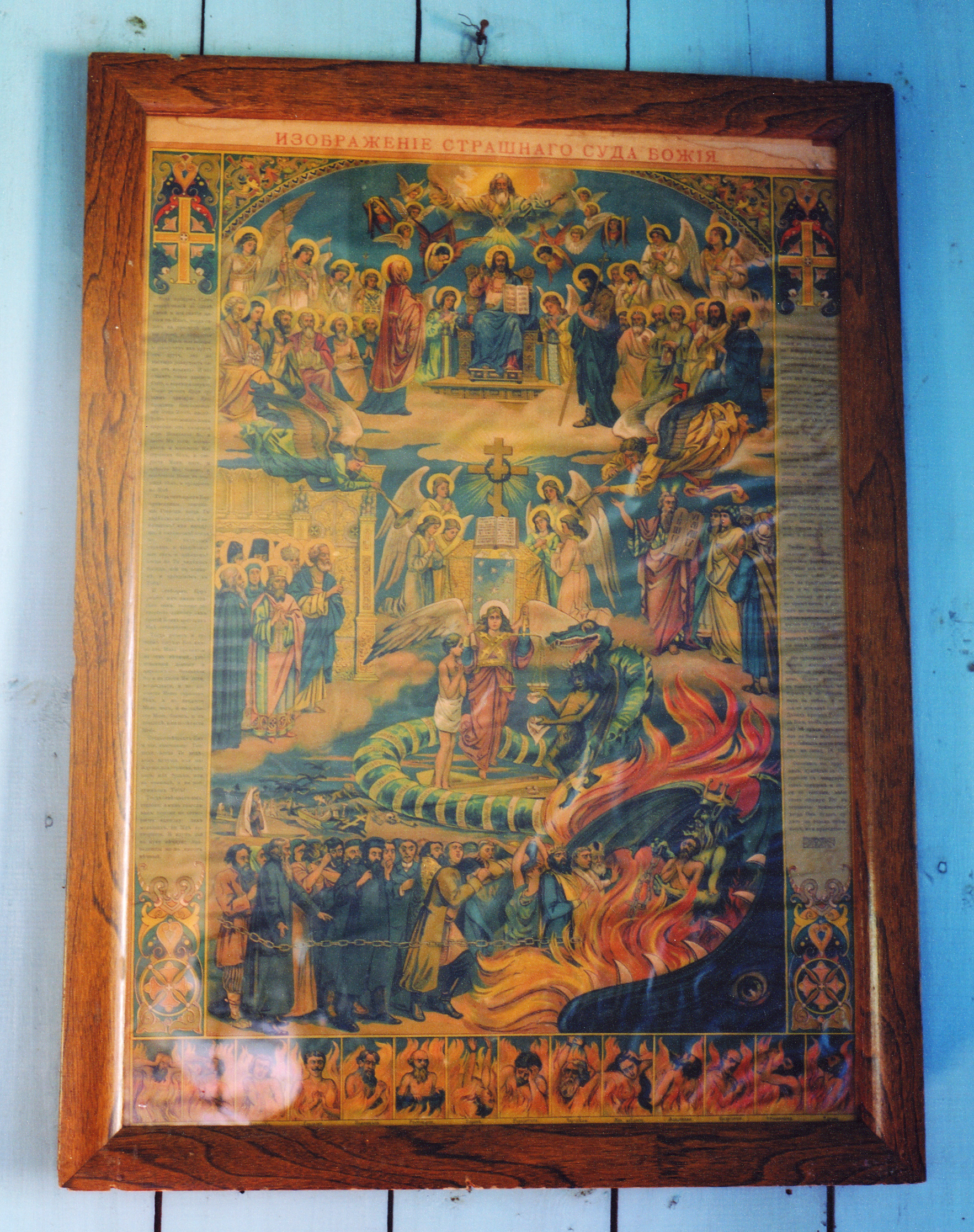 Image of St. Michael Historic Church outside of Gardenton, MB, illustrating an icon of the Last Judgment.