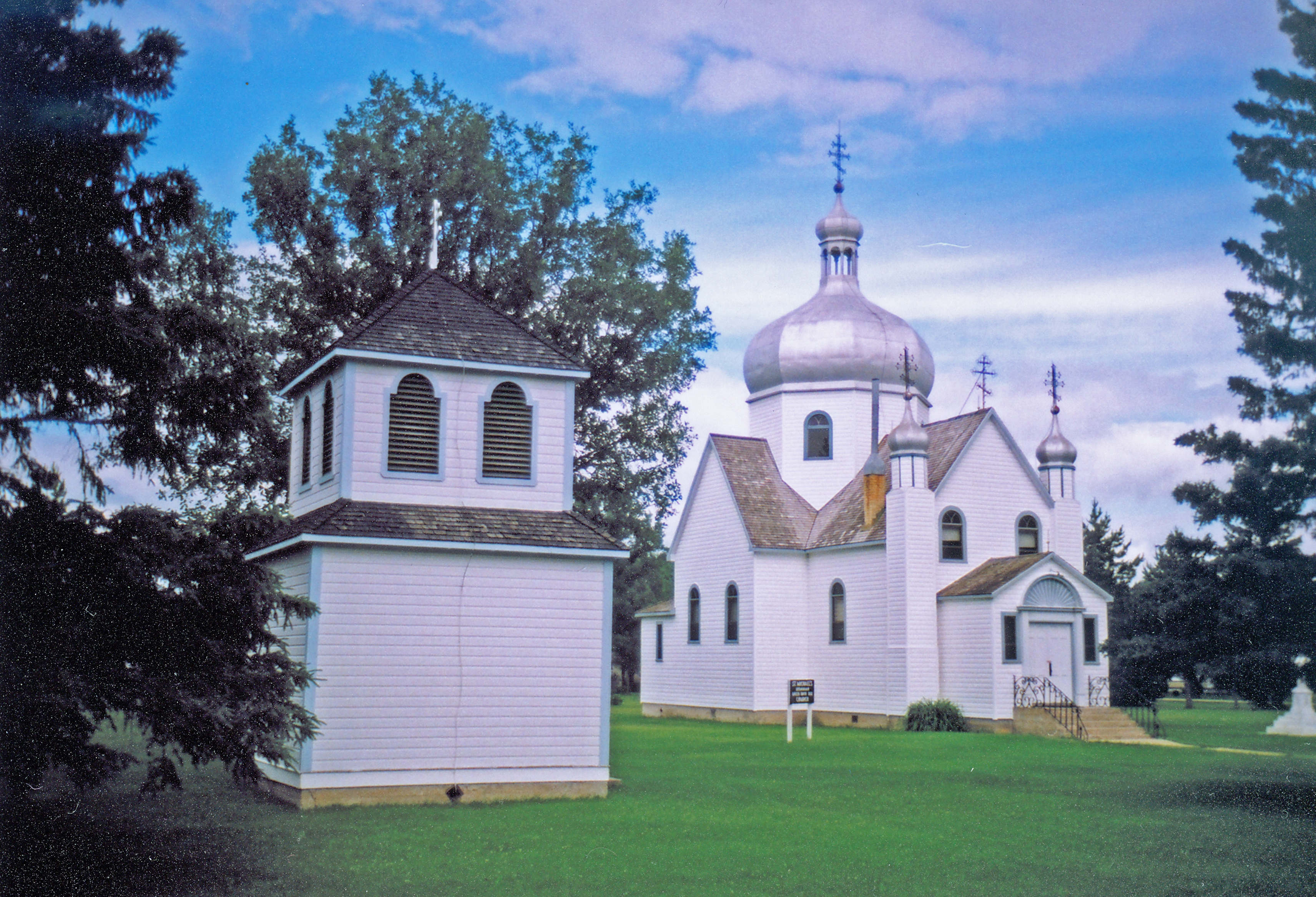 Image of St. Michael's Church in the village of Gardenton, MB, showing the exterior along with the belfry.