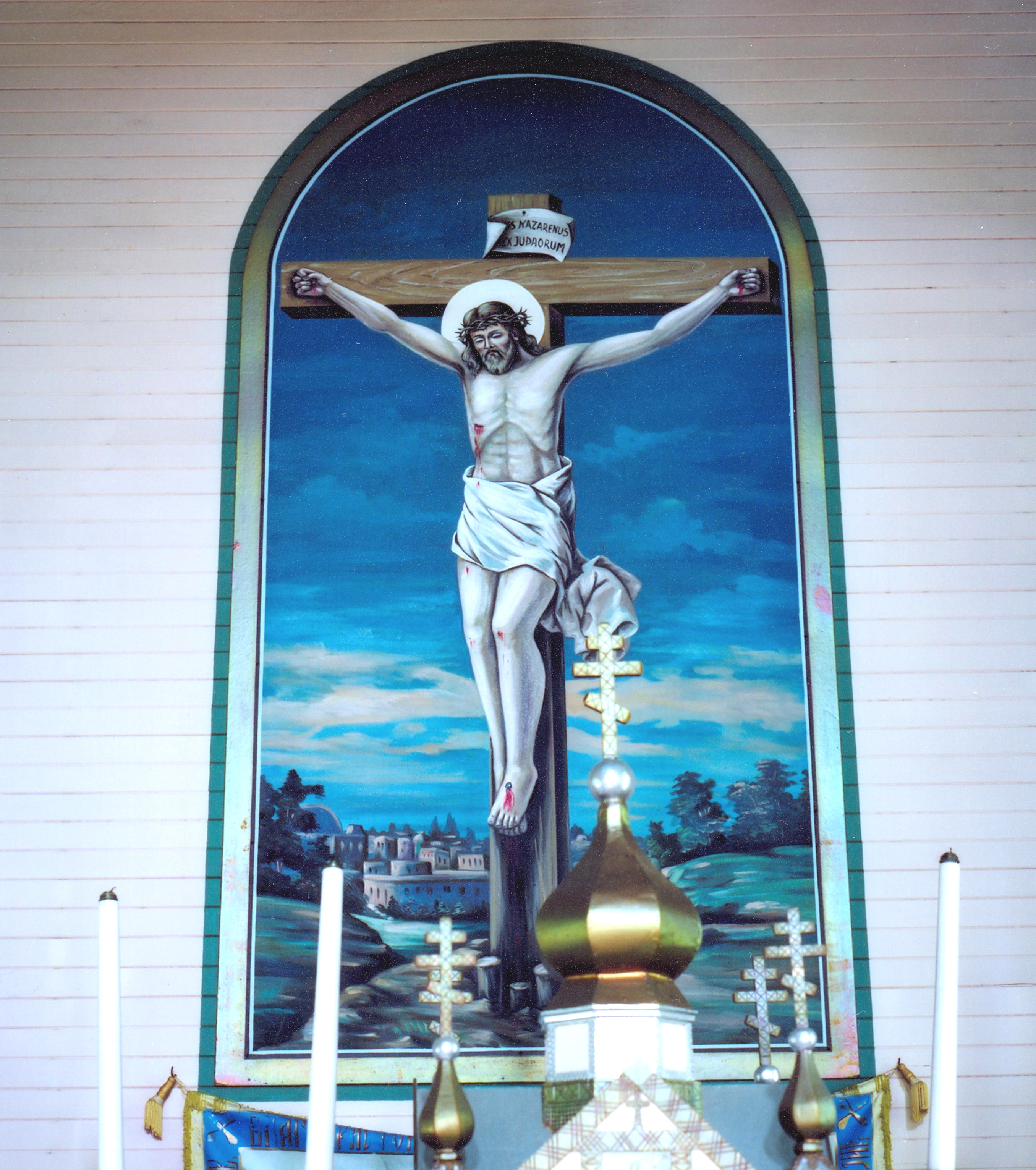 Image of the icon of the crucifixion behind the altar of Holy Trinity Church, Sifton, MB.