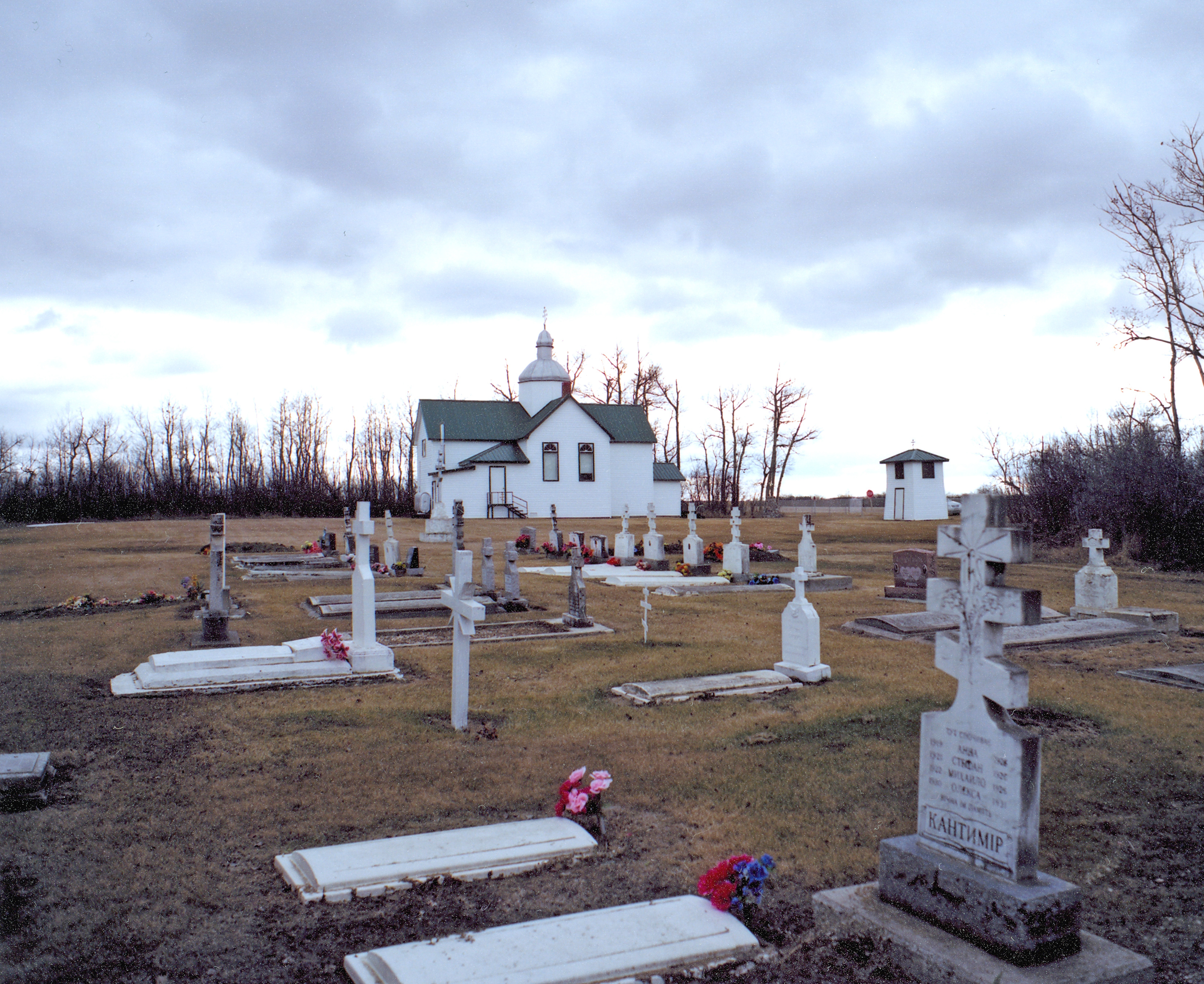 Sts Peter & Paul UOC, Brooksby, SK, image of the exterior as seen from the cemetery by S. Demchinsky (2010).