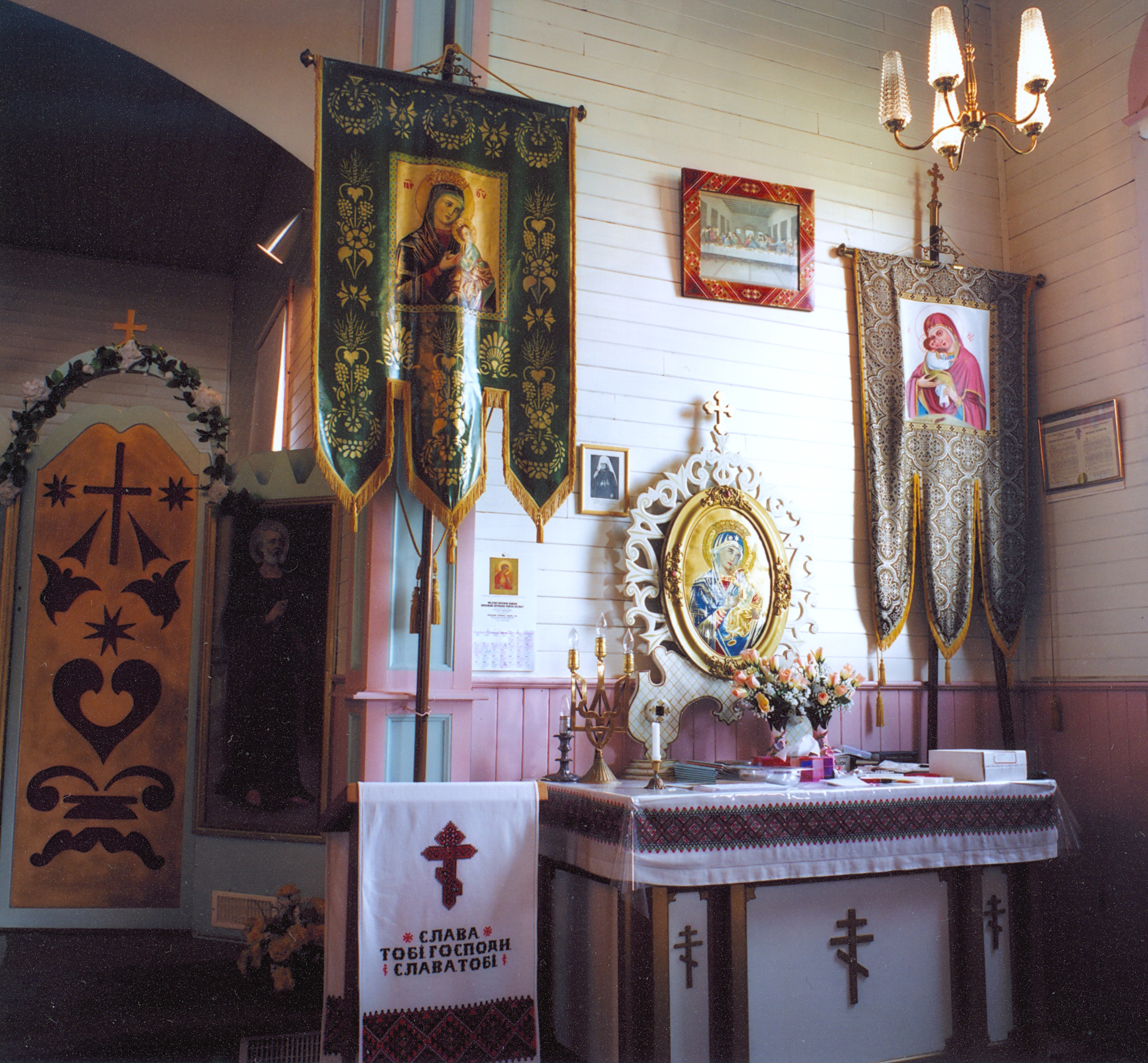 Sts Peter & Paul UOC, Brooksby, SK, image of the shrine to the right of the iconostas by S. Demchinsky (2010).