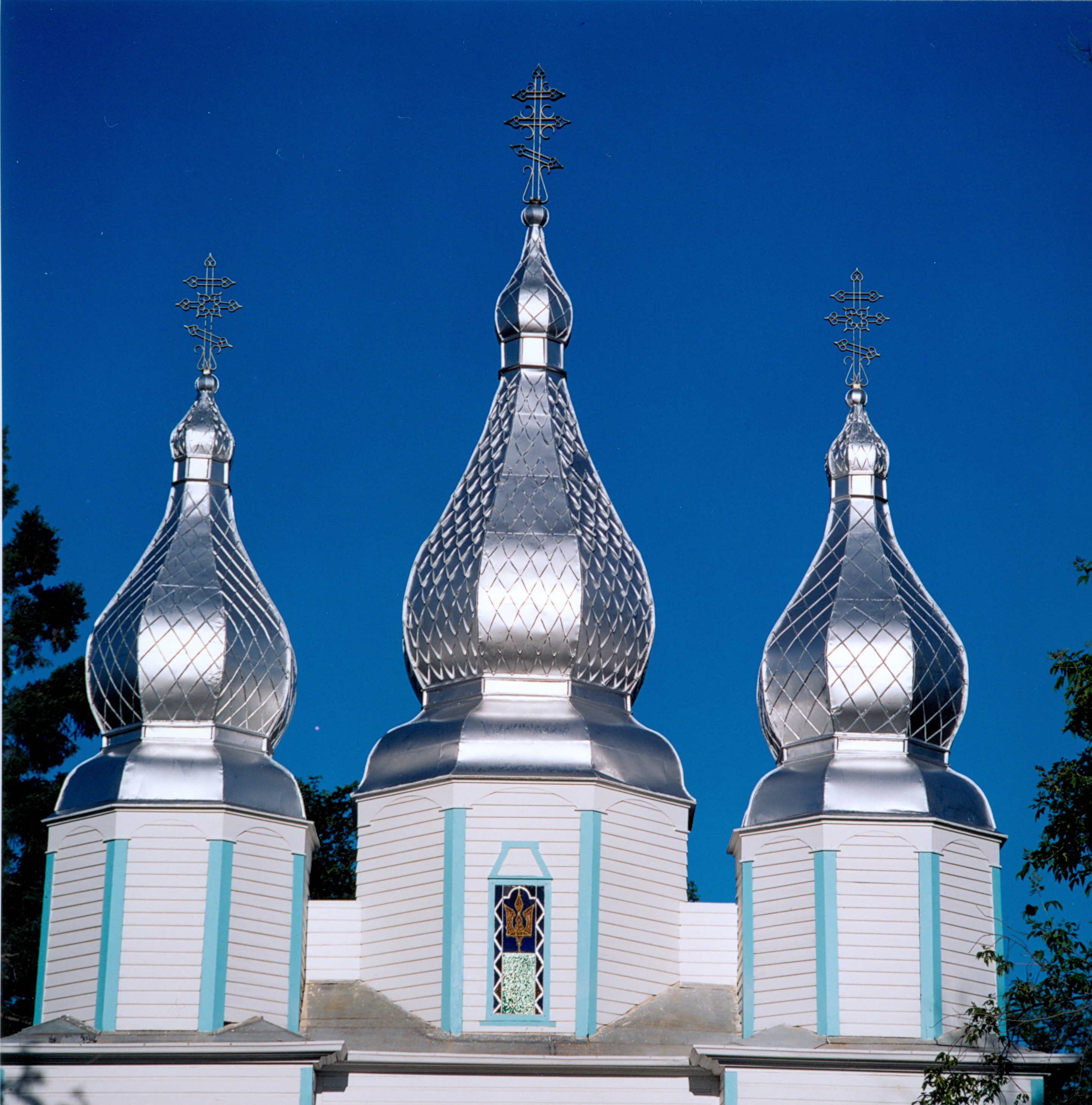 A detail of the domes of Holy Trinity Historic Church, Canora, SK. Photo by S. Demchinsky (2000).