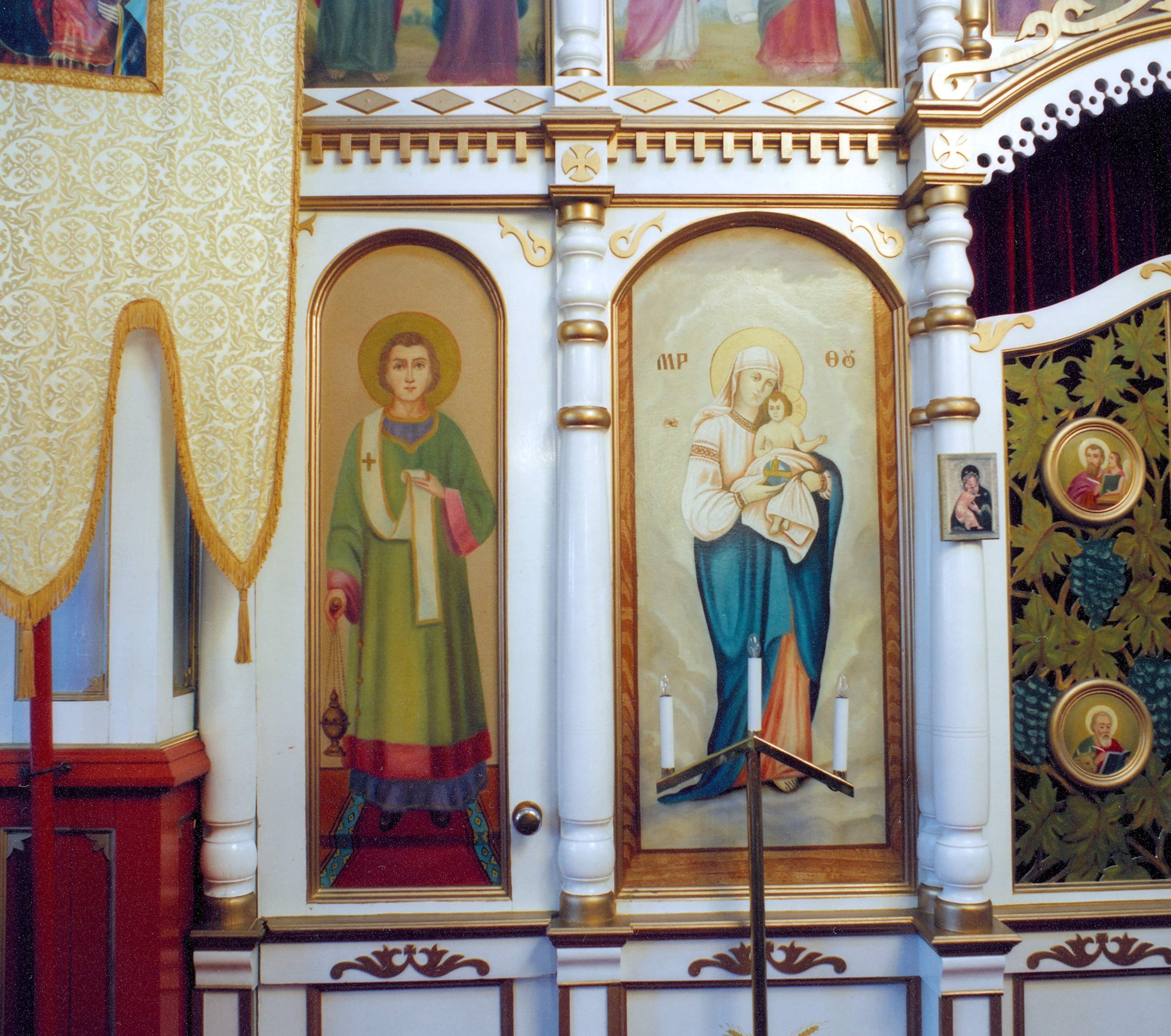 Interior image of Sts. Peter & Paul UOC, Coddette, SK, detailing a deacon and the Theotokos on the iconostas. Photo by S. Demchinsky (2010).
