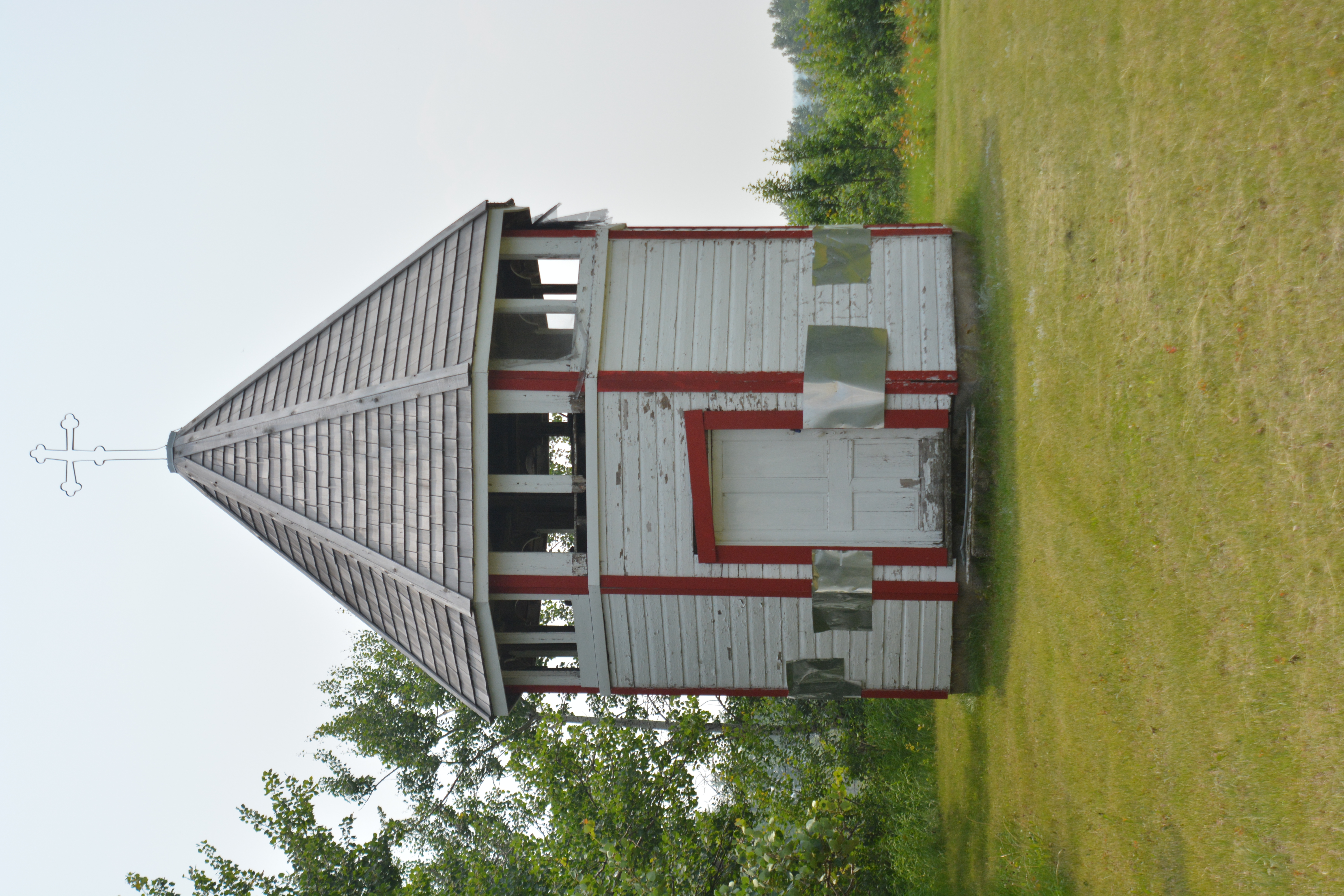 Image of the belfry of Dormition of St. Mary UOC located east of Insinger, SK. Photo by S. Demchinsky (2023).