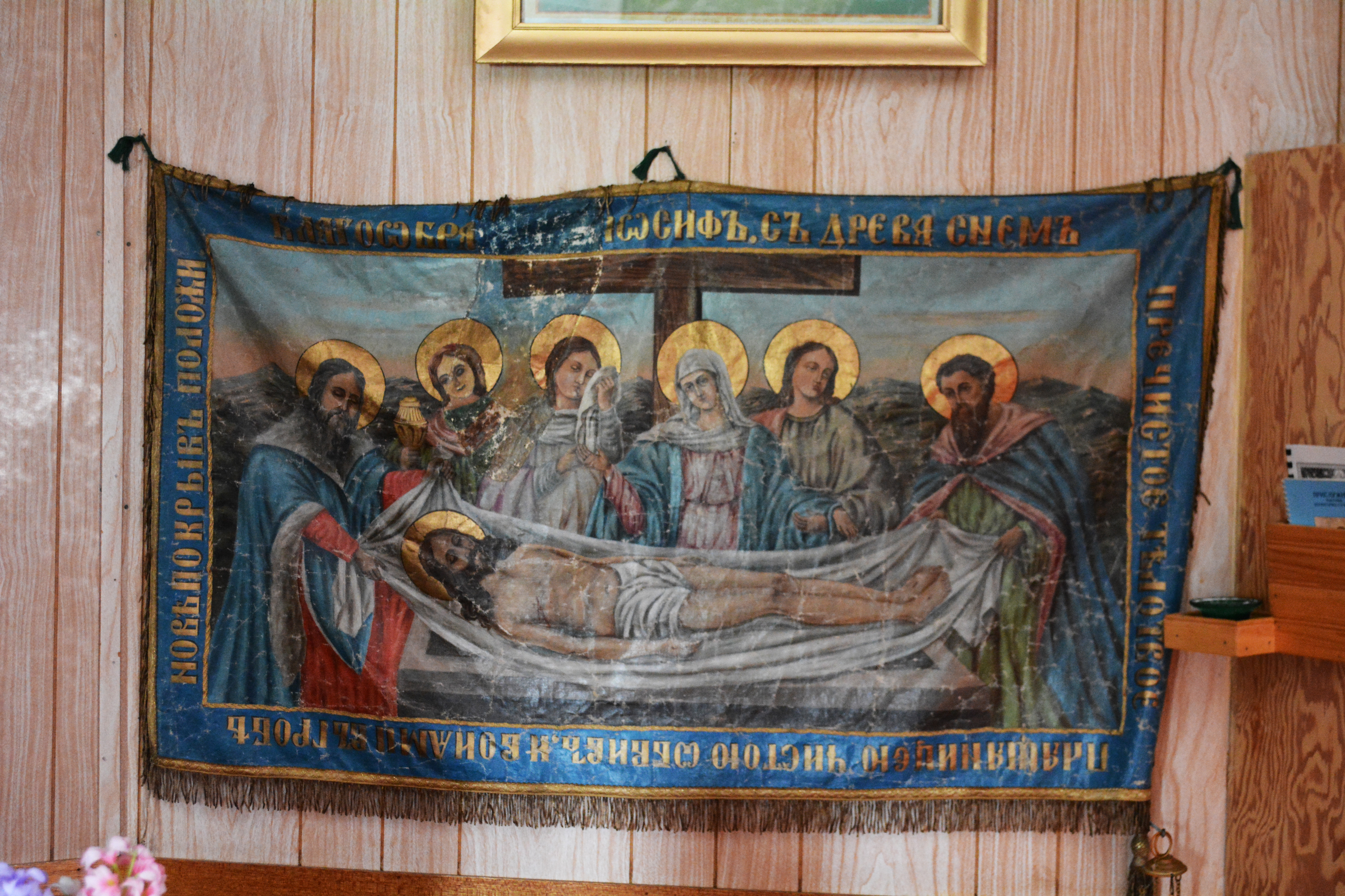 Image of the "holy shroud" (plaschynitsa) in St. Nicholas UOC near MacNutt, SK. Photo by S. Demchinsky (2014).