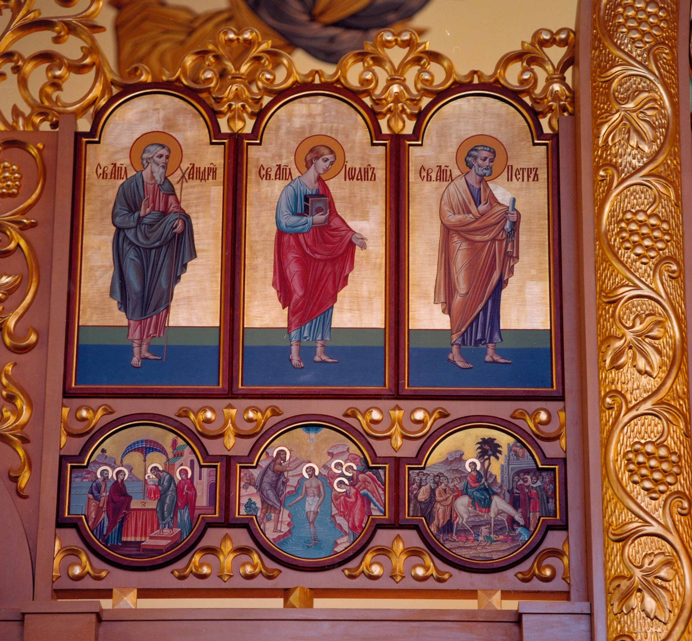 Detail of the iconostas showing part of the Apostles Tier and the Festal Tier of Holy Spirit UOC, in Regina, SK. Photo by S. Demchinsky (2004).