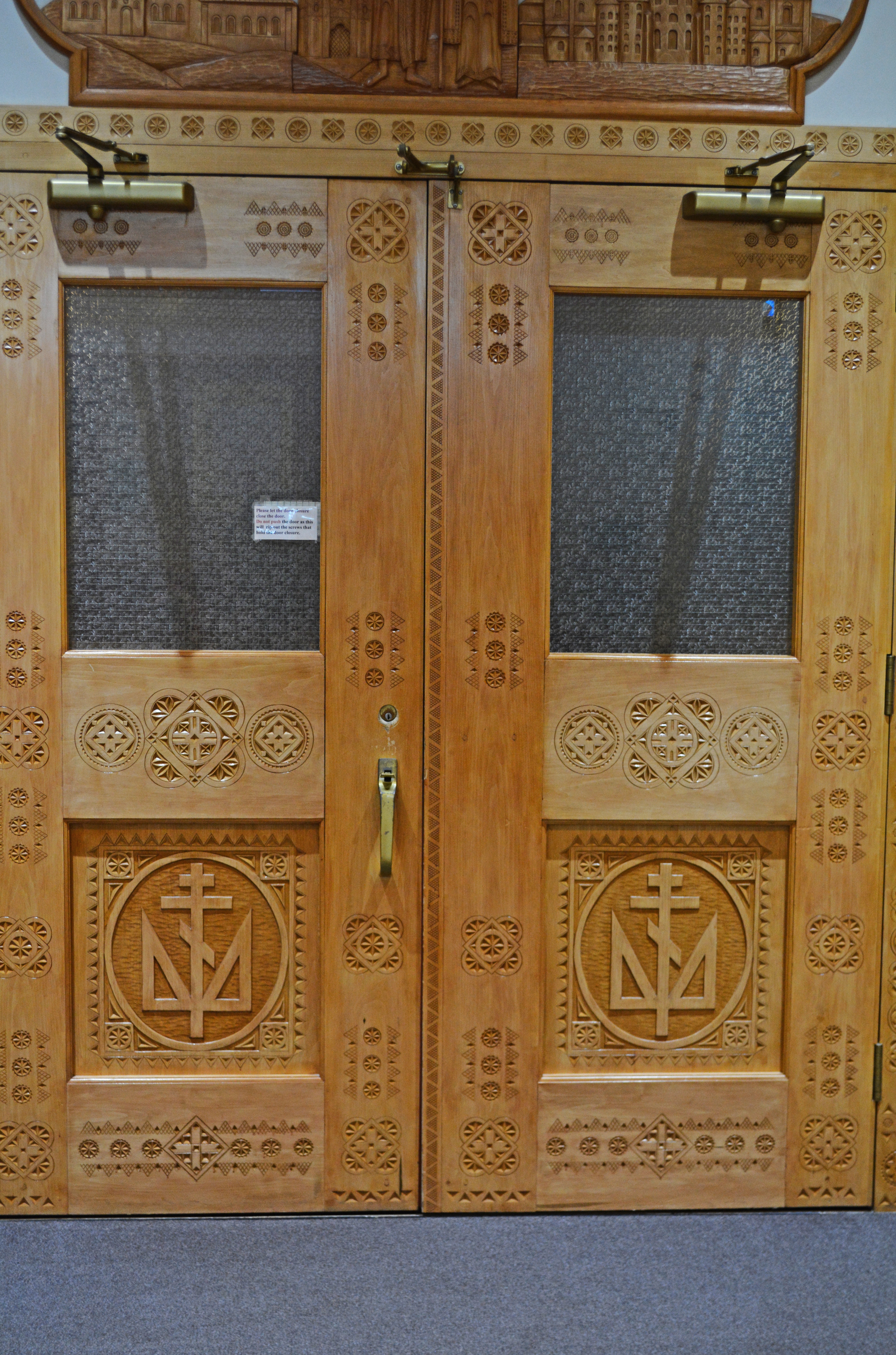 Hand crafted wooded doors in All Saints UOC in Saskatoon, SK. Photo by S. Demchinsky (2017).