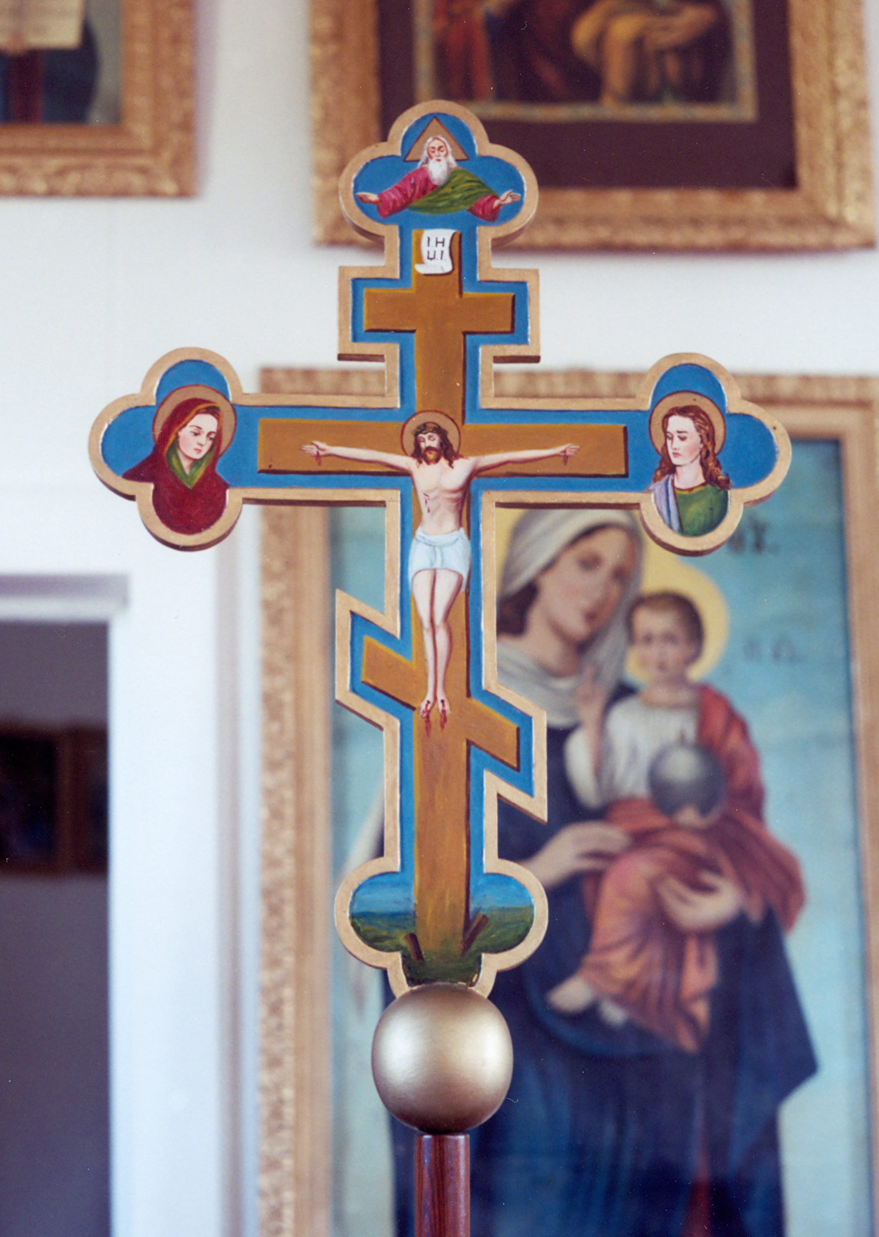 A processional cross in Dormition of St. Mary UOC, south of Sheho, SK. Photo by S. Demchinsky (1998)