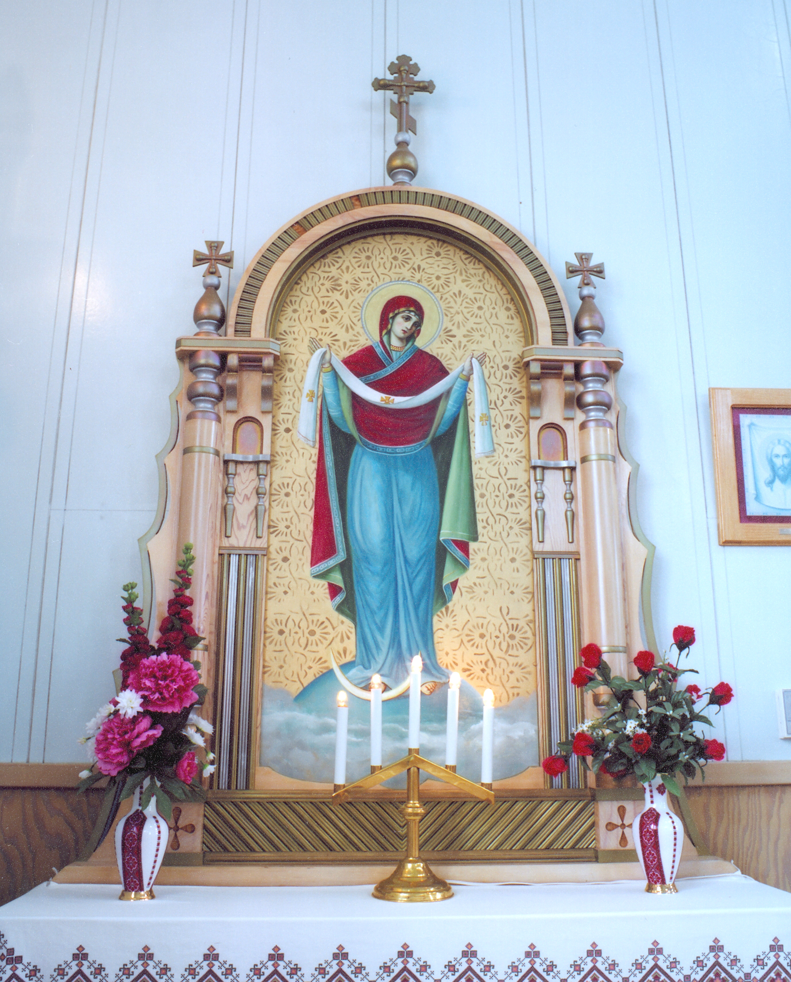 Shrine featuring an icon of the Protection of St. Mary in St. Mary the Protectress UOC at St. Julien, SK. Photo by S. Demchinsky (2010).