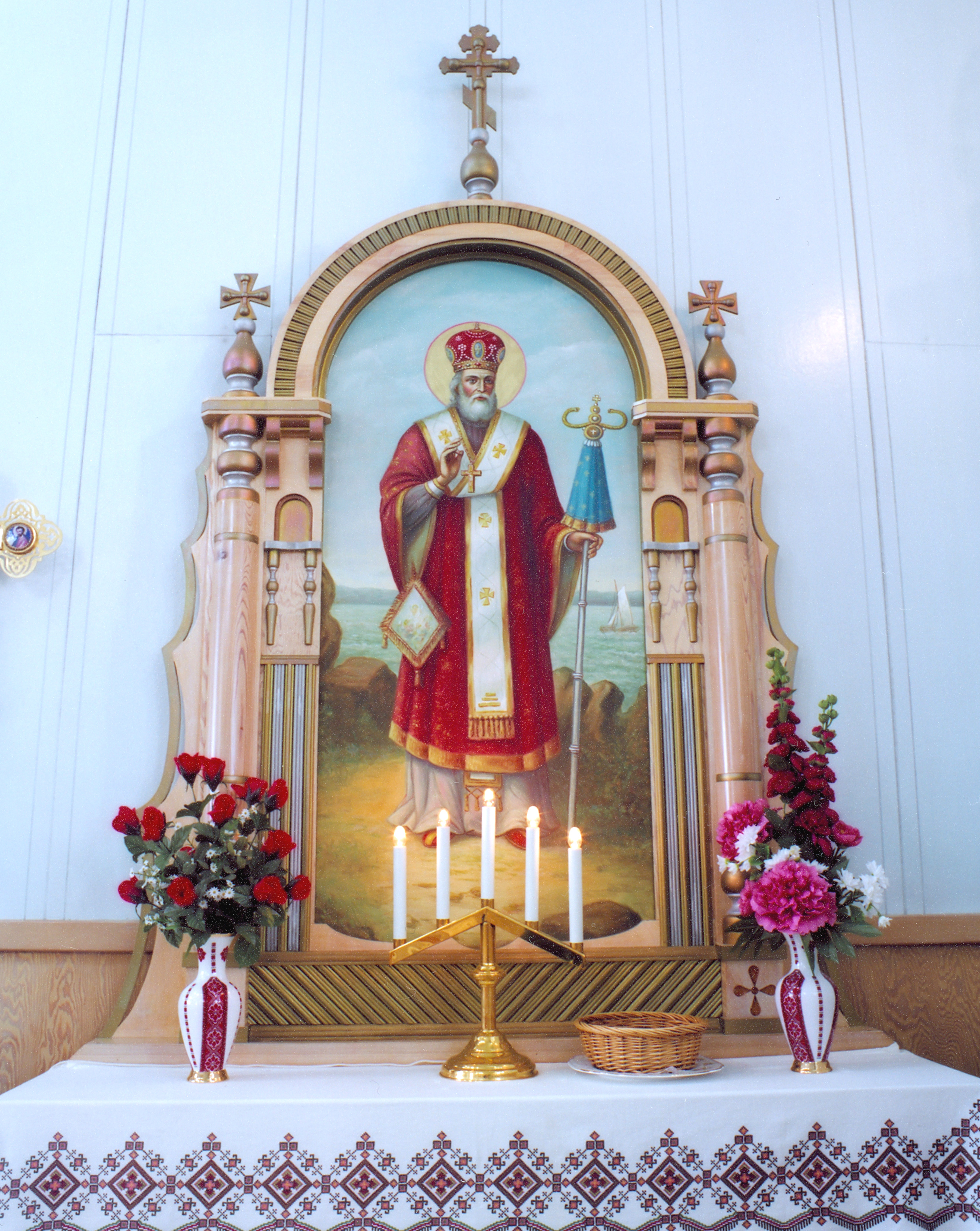 Shrine featuring an icon of St. Nicholas in St. Mary the Protectress UOC at St. Julien, SK. Photo by S. Demchinsky (2010).